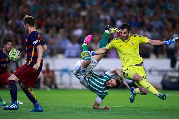 A seemingly unthreatening aerial ball from Messi bounced into the box and was slotted into an empty net with ease by Ivan Rakitic for the first goal of the game. Miscommunication between centre-back German Pezzella and keeper Antonio Adan prevented either of them from clearing the danger.