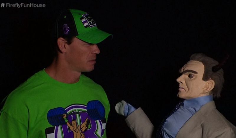 In the Firefly Fun House match, WWE went back to that era, where Kurt Angle challenged the Superstars in the back and asked them if they had "ruthless aggression". This challenge was answered by Cena. WWE used that segment, with Wyatt playing the Angle character. Cena tried to knock out Wyatt, but the former Universal Champion ducked, mocking Cena about how this ineptitude would have got him fired back then.