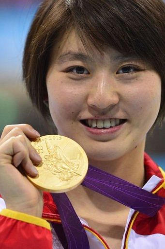 China’s Jiao Liuyang celebrates after winning the women’s 200m butterfly final swimming event at the London 2012 Olympic Games in London.
