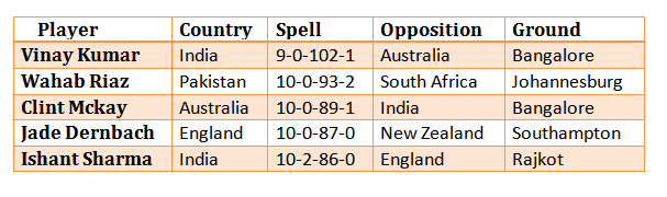 Here is a list of bowlers who conceded the most number of runs in an One-Day international spell in 2013. Indian medium-pace bowler Vinay Kumar, who conceded 102 runs in just 9 overs against Australia at Bangalore on 2 November, 2013, tops the list.