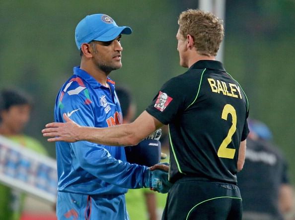 George Bailey of Australia shakes hands with MS Dhoni of India after the ICC World Twenty20 Bangladesh 2014 match between India v Australia at Sher-e-Bangla Mirpur Stadium on March 30, 2014 in Dhaka, Bangladesh.