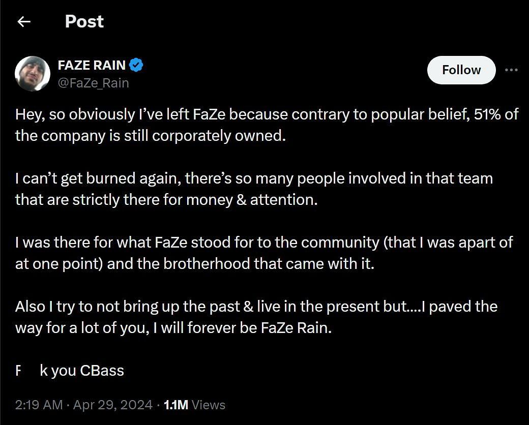 "I was there for what FaZe stood for to the community (that I was apart of at one point) and the brotherhood that came with it. Also I try to not bring up the past & live in the present but….I paved the way for a lot of you, I will forever be FaZe Rain."