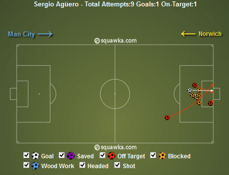 That attempted effort from Aguero was his first shot of the game, but he went on to have a total of nine attempts—three times as many as anybody else during the match. Norwich’s rather desperate defending at times contributed to the chances he had, but it was also displayed in that five of his efforts were blocked at very close range.