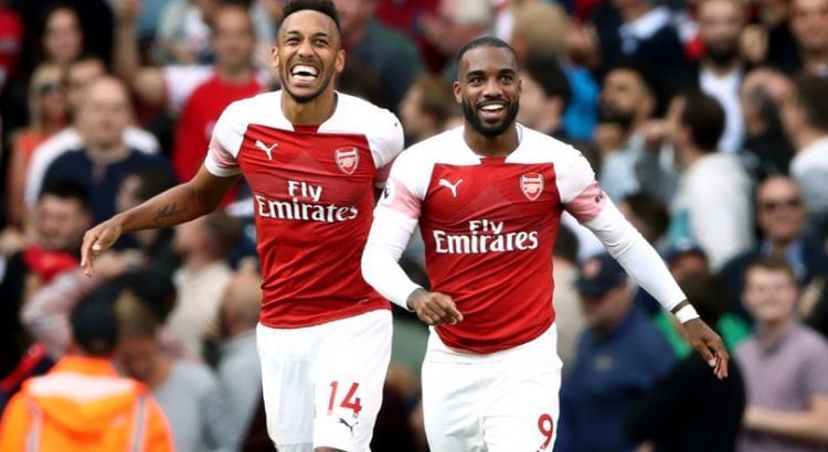 Pierre-Emerick Aubameyang and Alex Lacazette smile after a goal.