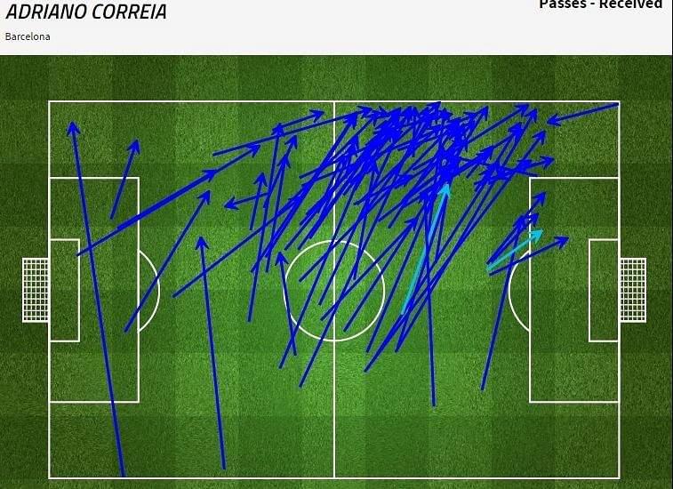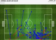 These arrow-marks show the passes received by Adriano and Alves in yesterday’s game and it is clearly evident that both the full backs have taken a very high position in the pitch, as they have received majority of the passes from a winger’s position.