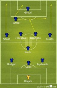 Giroud keeps the opposition central defenders busy with his strong physical demeanour. He is best suitable for Chelsea’s attacking game, which is mostly based on wingbacks putting in crosses into the box. Fabregas takes up the role of creator in this formation, and he is the only suitable person in the current squad to link up the midfield to attack.