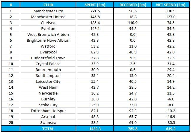 At the other end of the table, both the Mancheser clubs had a net spend of well over £100m.