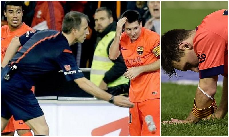 Barcelona forward Lionel Messi was hit on his head by a water bottle which was thrown from the stands at Valencia’s home ground Mestalla after Sergio Busquets had scored winner for the Catalan side in the 94th minute to win 0-1. The incident occurred right after the team celebration when all of them piled on top of another.