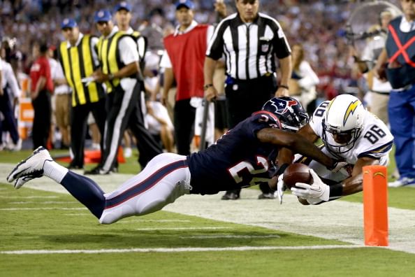 Wide receiver Vincent Brown #86 of the San Diego Chargers dives and touches the pylon for a 10-yard touchdown in the second quarter against the Houston Texans at Qualcomm Stadium