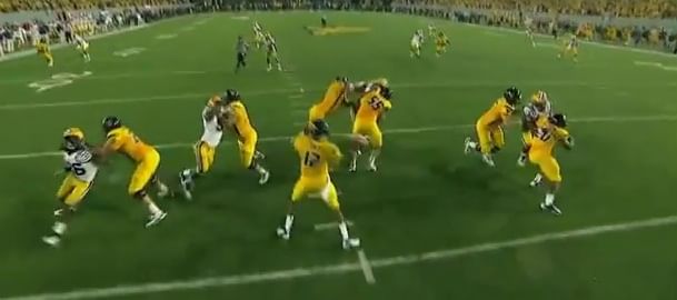 A quarterback, as shown here, is required to stand behind his offensive linemen in the “pocket”, and deliver the football down the field to his wide receivers (credit: bleacherreport.com)