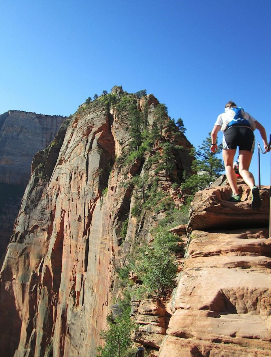 The path to the top includes 21 steep hairpin turns, known as Walter’s Wiggles, before arriving at Scout’s Lookout. The lookout is the last stop before the final trek to the top of Angel’s Landing. The final half mile, littered with narrow pathways, unevenly surfaced steps, and sharp cliff drop offs, is equipped with chains to grip for safety. Fatalties on the trail to Angel’s Landing have occurred, but the view and strenuous climb continues to attract hikers.