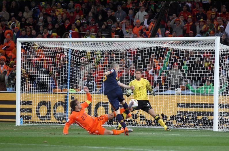 Spain were playing Netherlands in the final of the World Cup and the game had gone goalless and it looked like penalties would decide the winner, but in the dying minutes of the game Iniesta latched on to a pass from Cesc Fabregas and scored the goal that won Spain the 2010 FIFA World Cup.