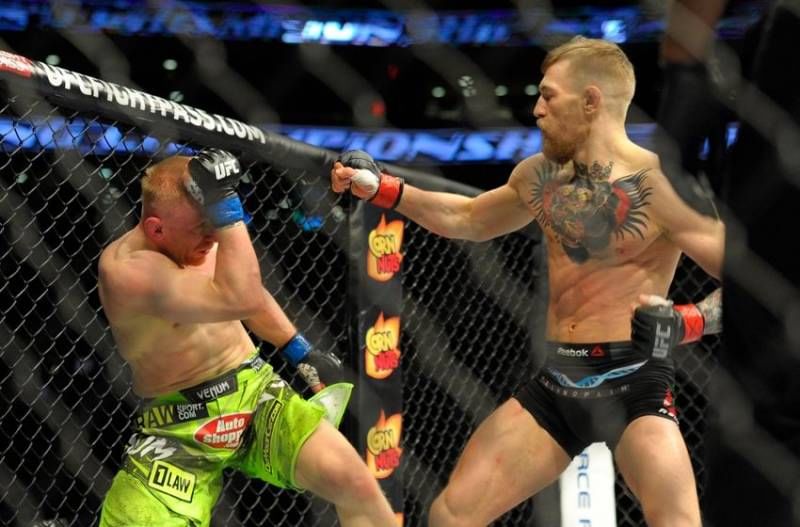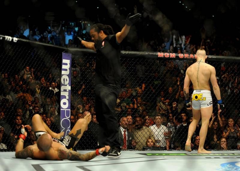 Brandao landed some good punches of his own and body shots but McGregor stalked Brandao on the cage, landed a left hook to drop the Brazilian. McGregor follows up and unloads a series of right hands to Brandao who was just covering up. The referee Leon Roberts stops the fight when Brandao doesn't react. Conor McGregor stopped Brandao via strikes at 4:08 minutes of round 1