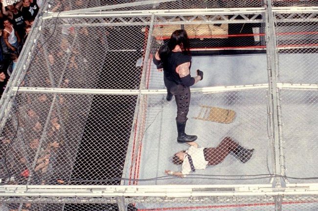 With the start of the match, Foley climbed up the cage and dared the Undertaker to join him. The two fought at the top of the cage after Undertaker accepted the challenge. When Foley reached the edge of the case, The Undertaker grabbed him and tossed him.