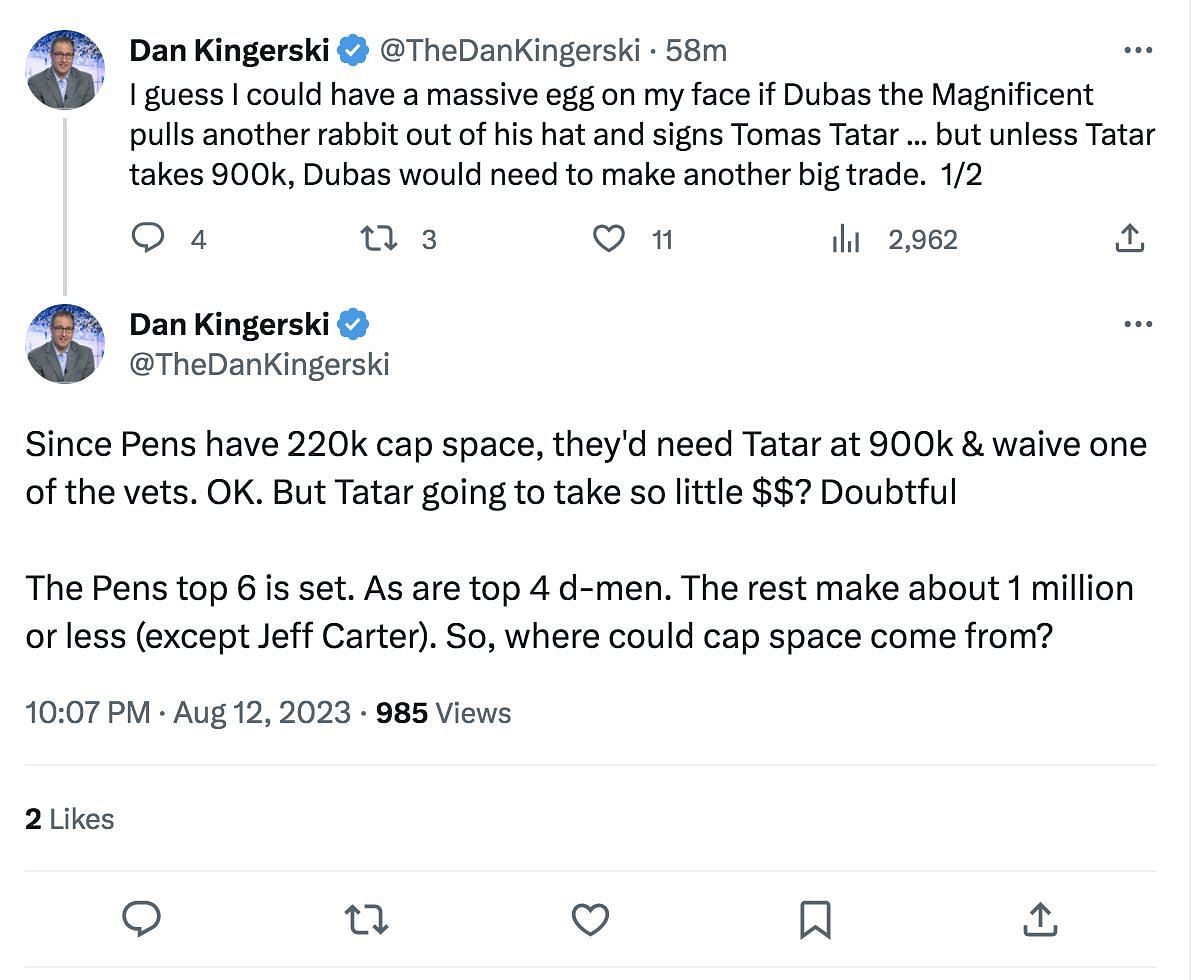 "Since Pens have 220k cap space, they'd need Tatar at 900k & waive one of the vets. OK. But Tatar going to take so little $$? Doubtful."