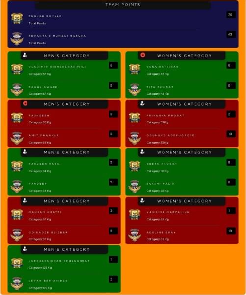 Mumbai fought back to level the tie in the 53kg Women’s bout with Odunaya Adekouroye outclassing her opponent Priyanka Phogat. The first round was 4-2 in favour of the African wrestler and was evenly matched, but she seized the initiative with a massive spinebuster which earned her four points and she eventually went on to win 10-2.