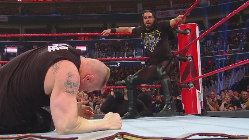 Since Seth Rollins will be teaming up with Becky Lynch, Lesnar could come out to claim the title after the duo win their match against Corbin and Evans. As Lesnar is about to pin Rollins for the Universal Title, Lynch could come to his assist by wielding a chair and taking out Lesnar with repeated shots.