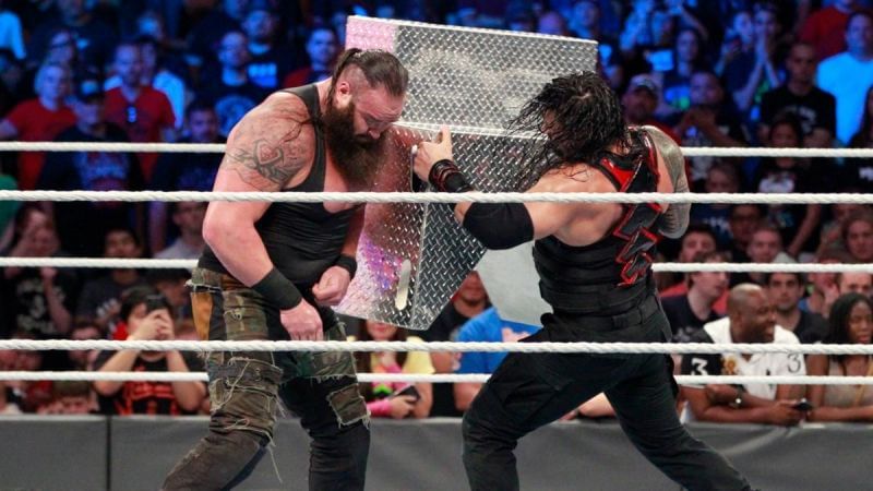 Braun Strowman just finished dispatching WWE Universal Champion Brock Lesnar via repeated destruction with the ringside tables. The medics strapped him to a gurney to receive treatment backstage and the action between the other three competitors in this 4-way match resumed. Roman needed an equalizer against the man who just flipped a announce table onto a former UFC Heavyweight Champion, so he struck Strowman with steel steps.