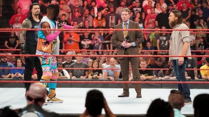 On the 6th May edition of Monday Night RAW, Vince McMahon came out, followed by Roman Reigns (who announced he would be there). A returning Daniel Bryan followed and behind him was WWE Champion Kofi Kingston.
