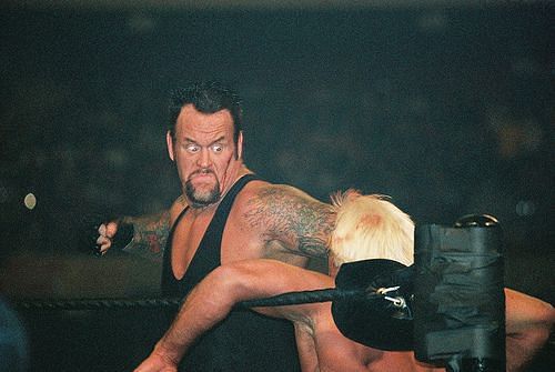 The introduction of a chair adds to Hardy's advantage before Undertaker responds by throwing his minuscule challenger at the ring, barricade, ladder, announce desk, and any other pain-creating object in the arena.