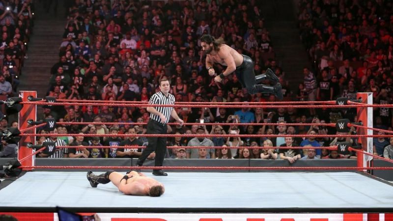 Enter Seth Rollins. Rollins and Miz proceed to have a fun match that the crowd really got into, and Seth picked up the win with a huge frog splash on The Miz who was on the other side of the ring! As Rollins was celebrating, his party was pooped on by none other than Finn Balor.