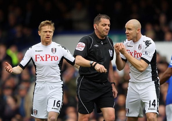 Damien Duff (l) and Philippe Senderos of Fulham appeal to referee Phil Dowd as he awards a penalty for hand ball during the Barclays Premier League match between Everton and Fulham at Goodison Park