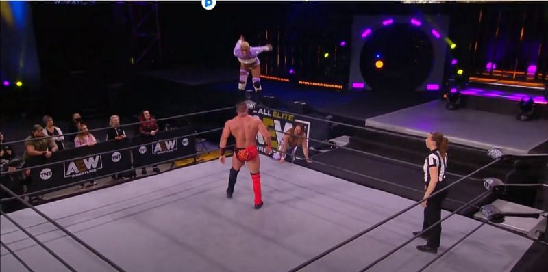 Silver dropped Skyler with a shoulder tackle. The Dark Order member relied on his agility to deliver a dropkick and a hurricanrana.