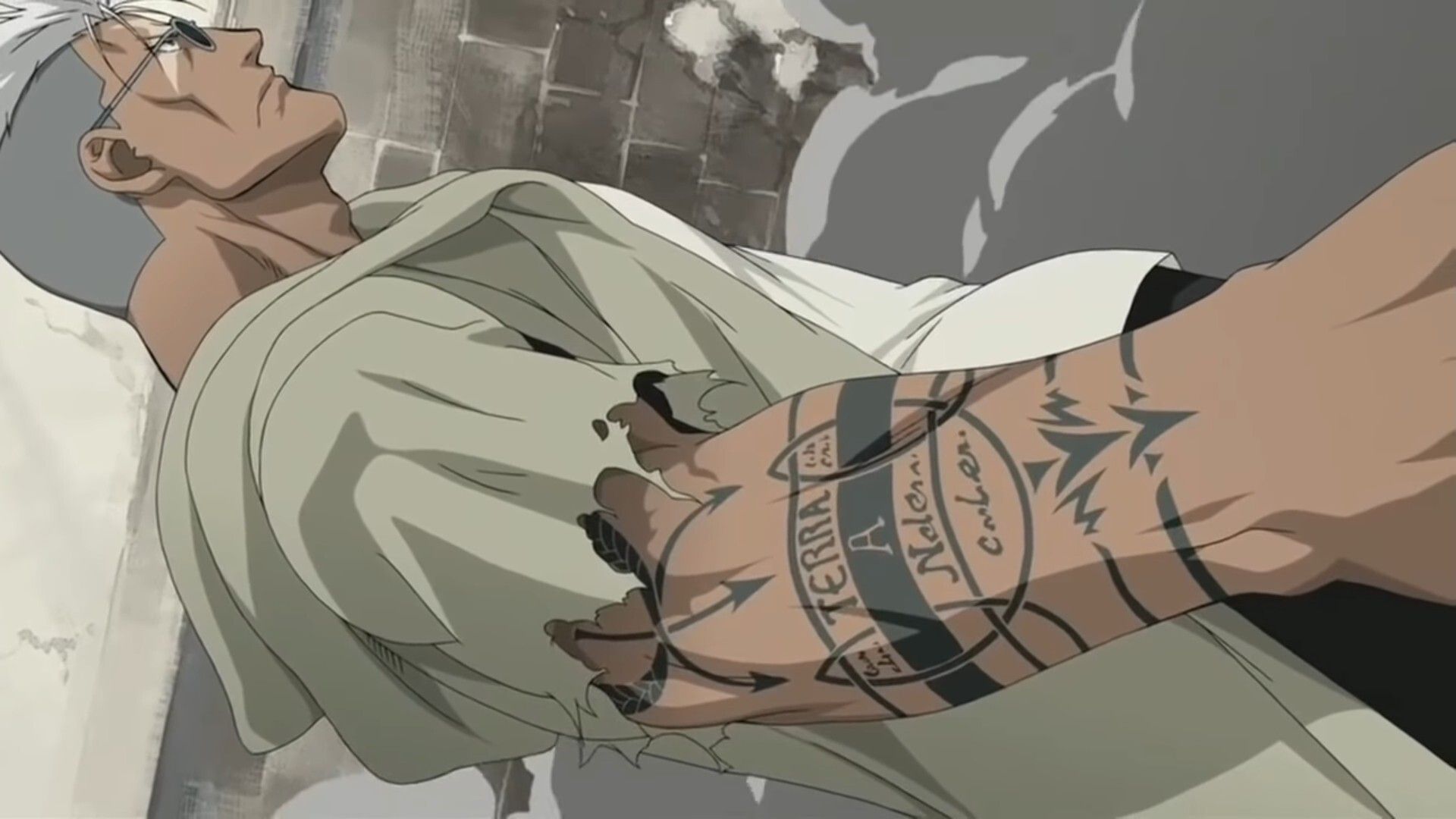 Scar from Fullmetal Alchemist: Brotherhood is one of those anime characters with tattoos that play a significant role in his backstory and character development. Following an attack on his homeland by Amestrian Forces, Scar lost his right arm and was at risk of dying. His brother, who had researched various forms of alchemy tattooed an array for destruction on his right arm, which he gave to Scar to save him in exchange for his life.