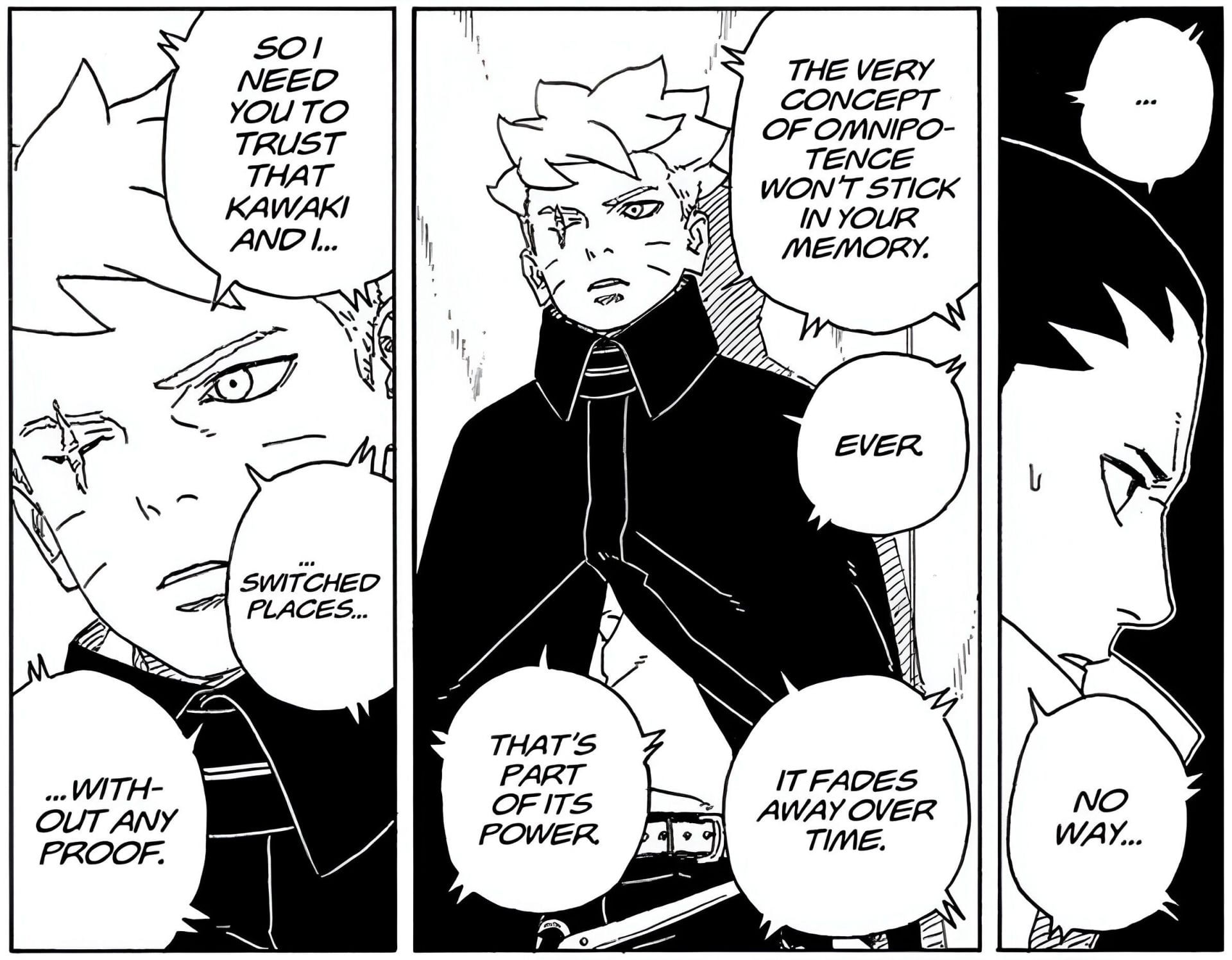 In the manga's latest chapter, Boruto was seen telling Shikamaru that he need not bother to figure out Omnipotence Shinjutsu because it was pointless. According to the Shunjutsu's rules, Shikamaru would soon forget how Omnipotence worked because its concept would not stick to the memories of those who have been affected by it.