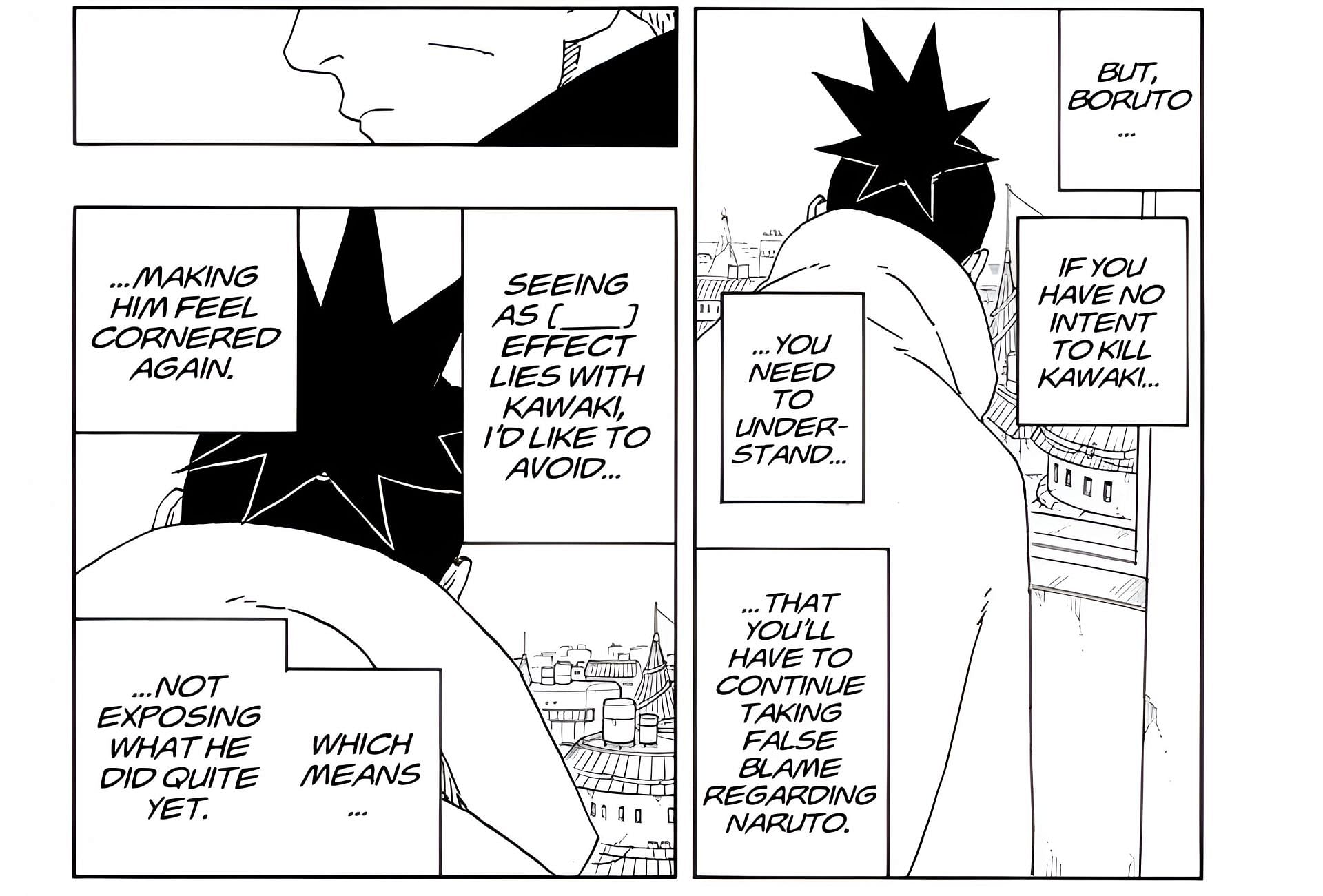 In this flashback, Shikamaru and the protagonist were having the same conversation, and the former requested the latter to take the blame for killing Seventh Hokage because the power of '_' was with Kawaki. The protagonist complied and said that it was not like he had any other choice.
