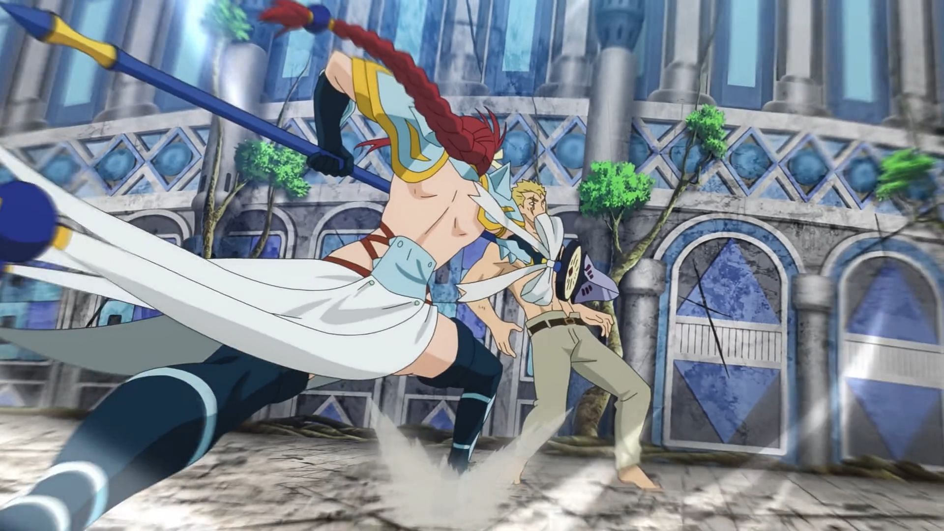 As the duel continues, Kiria, a fellow Dragon Slayer, wakes up and observes the fight, surprised to realize that both combatants belong to the same guild. Erza switches strategies and equips two swords enchanted with the magic of Natsu’s Fire Dragon Flames and Gray’s Ice Devil Chill.