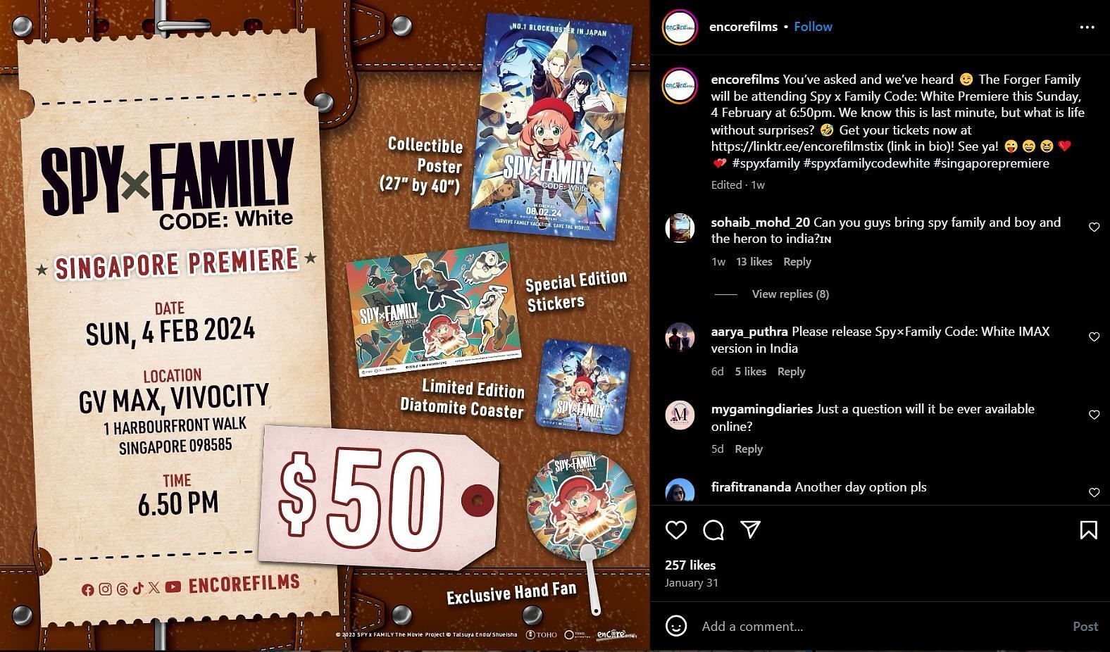 The company did not directly announce the same but confirmed it by replying to a comment. The social media account had posted details about Spy X Family Code: White's Singapore premiere.
