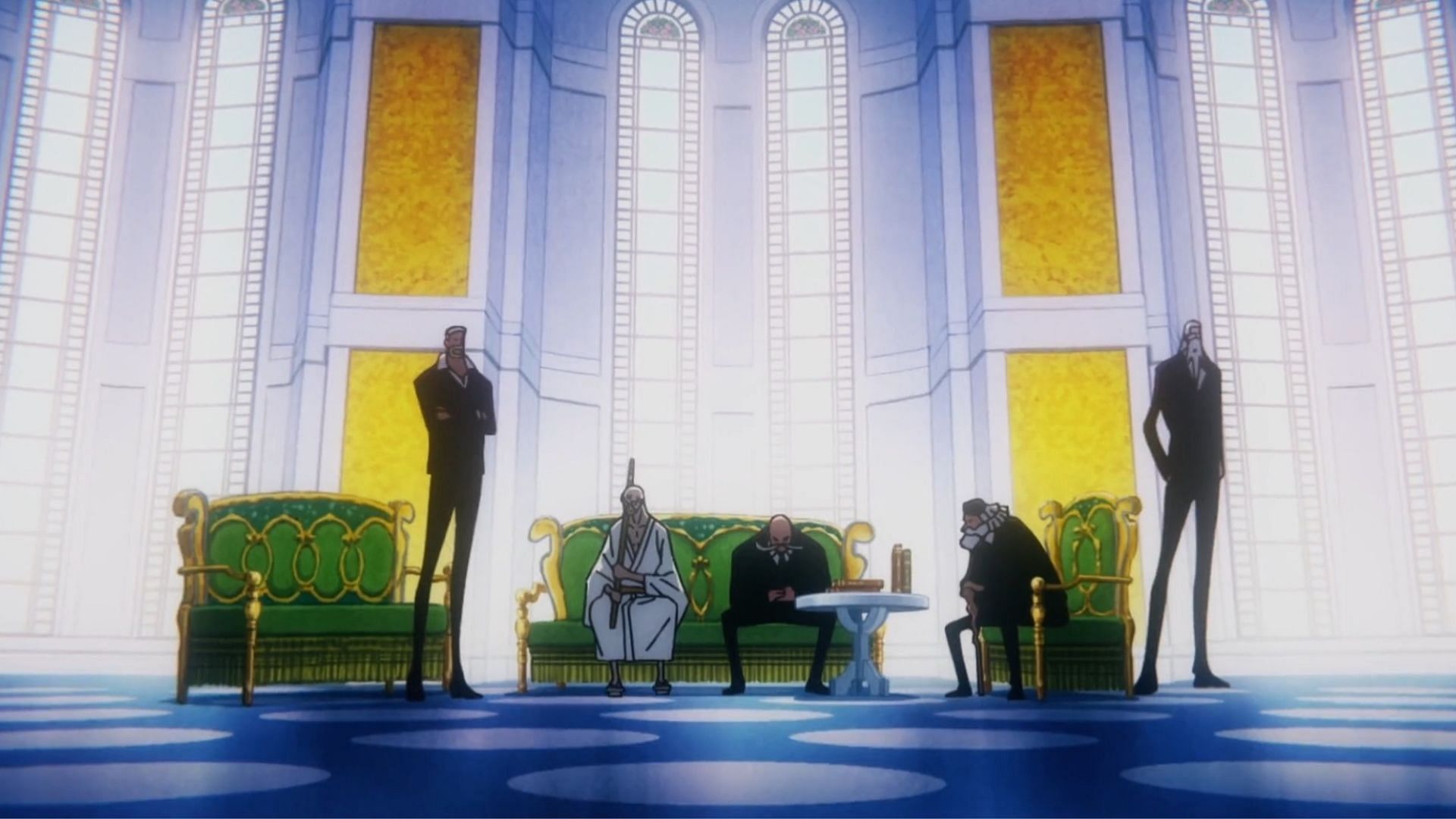 Meanwhile, at Sacred Marijoa, the Five Elders were alarmed because a legendary Devil Fruit that had eluded them for centuries had resurfaced. They had been unable to obtain it because the World Government had changed its name to conceal its actual identity.