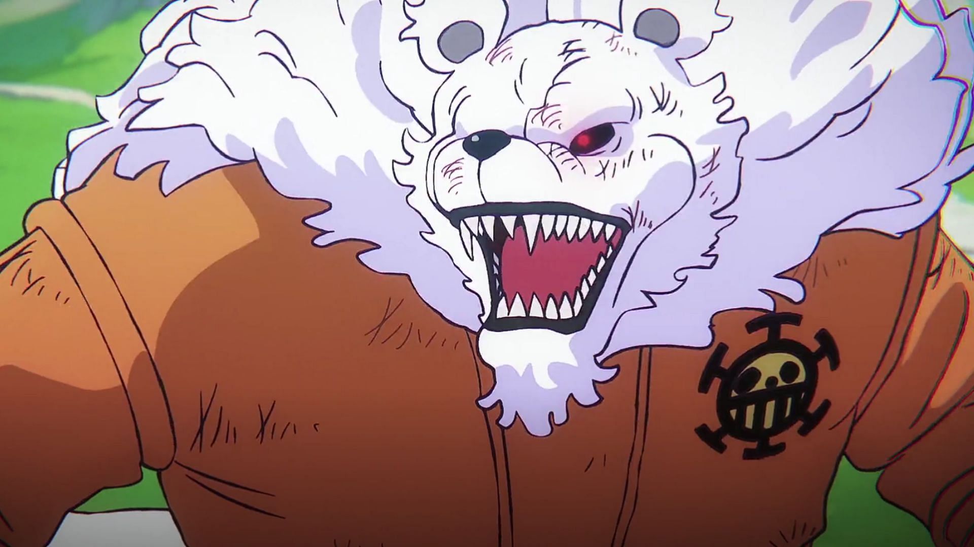 Meanwhile, on Winner Island, Blackbeard is seen laughing as Law lies on the ground. It turns out that his ship had sunk and his crew had been lost. As Blackbeard approaches Law to take his Op-Op Fruit, Bepo, the only other Heart Pirate on the island, consumes one of Chopper's drugs, transforms into his Sulong form, and attacks the Blackbeard Pirates. Although the effect is short-lived, Bepo manages to grab Law and escape by swimming away.