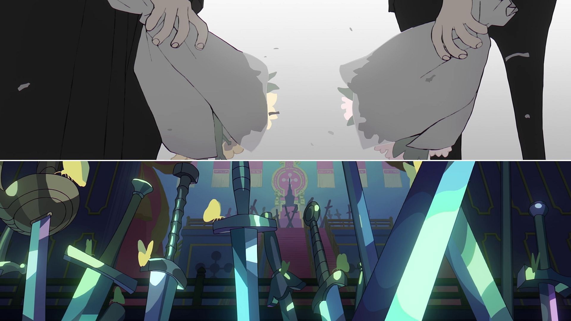 The opening then teases Vegapunk and Dragon’s past meeting, in which the two paid homage to Ohara. Suddenly, the sequence changes into swords and butterflies around Mary Geoise’s Empty Throne, with Imu-sama ominously sitting on it in the background.