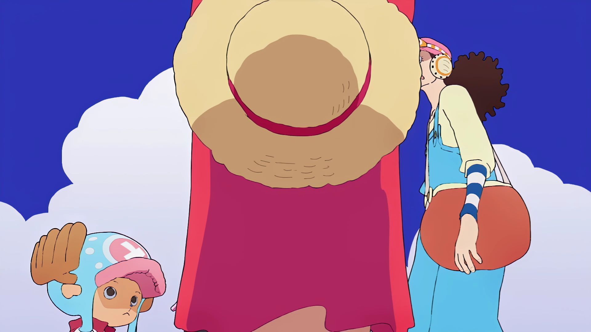 The opening ends by showing Luffy from behind. The last scene of Megumi Ishitani’s masterwork is, curiously, the same where Luffy is describing his true dream to his companions at the very beginning. This shot is just framed from a different angle.