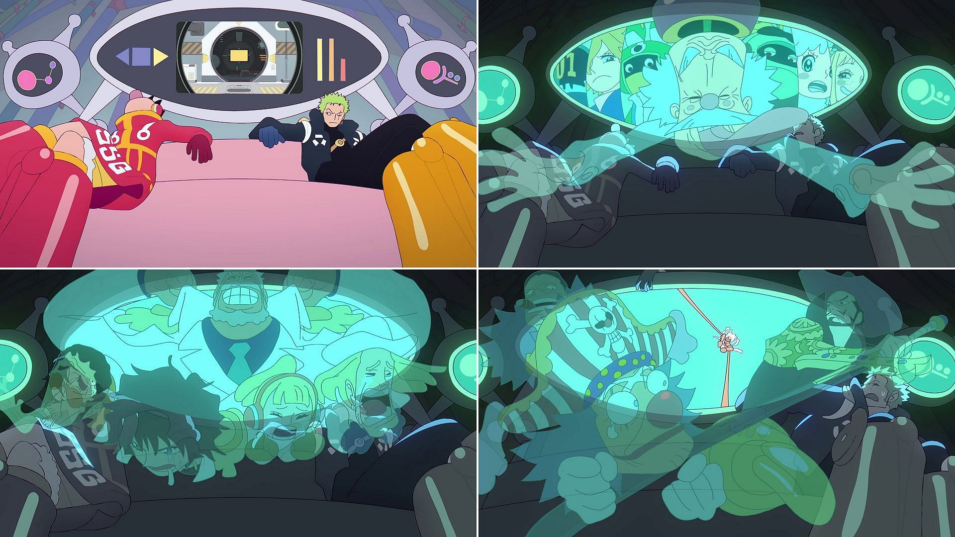 As Luffy messes around with his DOM shoes, he ends up activating them, which sends him flying towards the screen. The smoke Luffy leaves behind serves as a perfect transition for the next sequence, which features several shots of the Egghead Arc’s initial part.