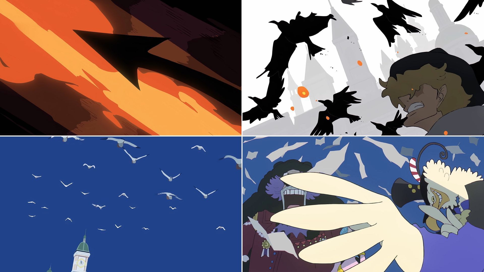 Behind Sabo, Karasu’s black crows soar into the air over Mary Geoise, then transition into white seagulls, the News Coo, reaching Arabasta. Needless to say, the sequence foreshadows the sad news of Nefertari Cobra’s death.