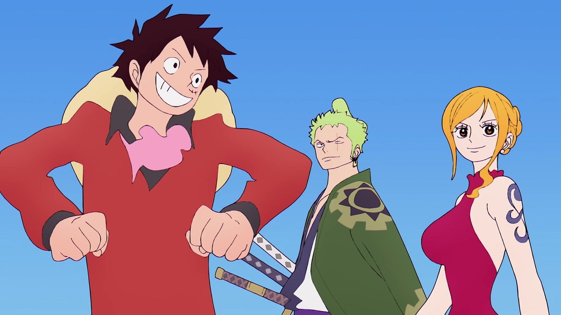 Luffy returns to the scene in grand style as he goes through all the various outfits he wore throughout the series. The other Straw Hats add up in three brackets, starting with Zoro and Nami (who, alongside Luffy, create the Original Trio), continuing with Usopp and Sanji to form East Blue Five, going on with Chopper and Nico Robin, as well as Franky and Brook, and finally ending with Jinbe.