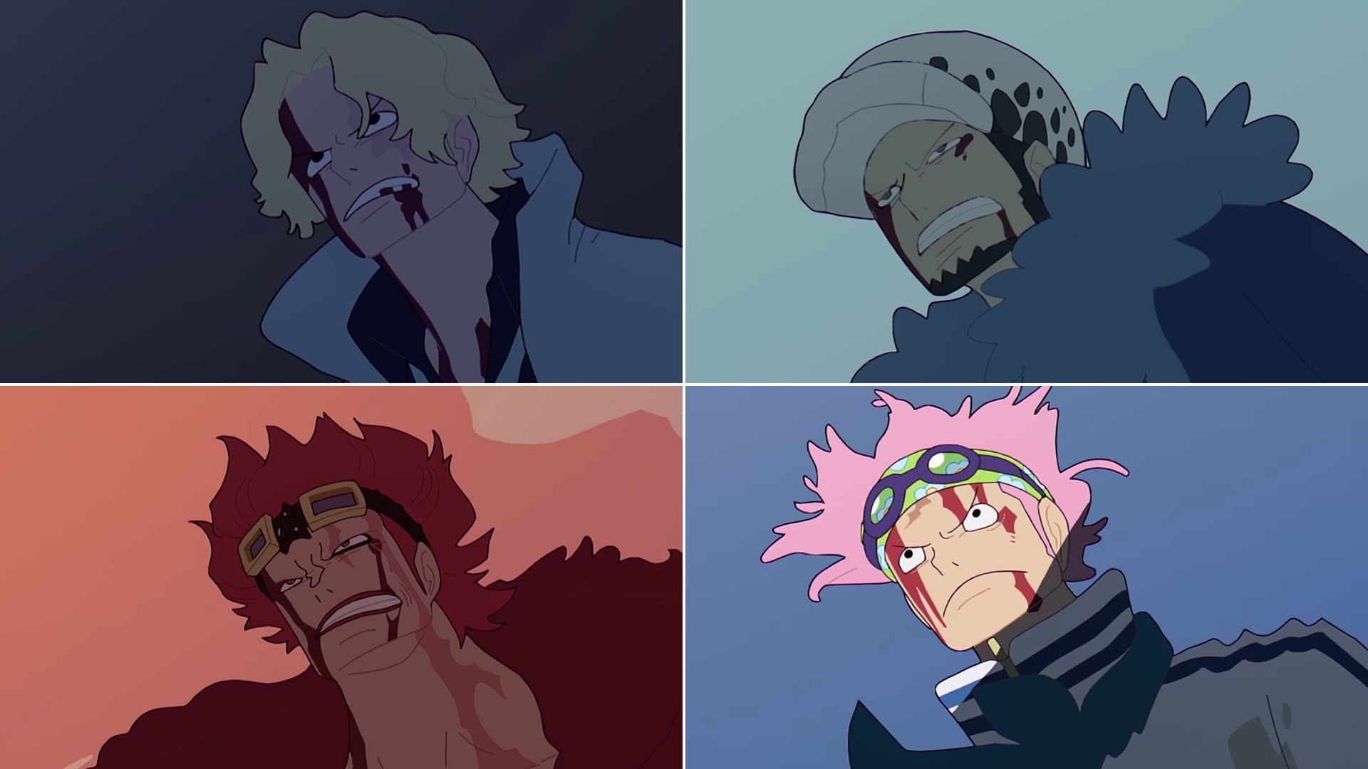 One after another, Sabo, Kid, and Law are shown, all visibly injured and covered in blood, as well as enveloped in a dark background. Koby is depicted in the same way, but he soon manages to stand up and get out of the darkness, which symbolizes that, unlike the others, he was able to fend off his enemies.