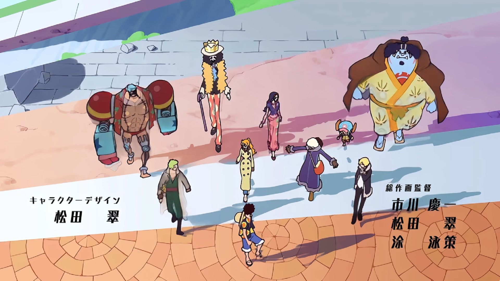 In the next sequence, the Straw Hat Pirates are shown walking together in their brand-new Egghead outfits. This scene is a callback to the franchise's fourth opening, Bon Voyage!, which featured an identical pattern, with the Straw Hats of the time wandering cheerfully.