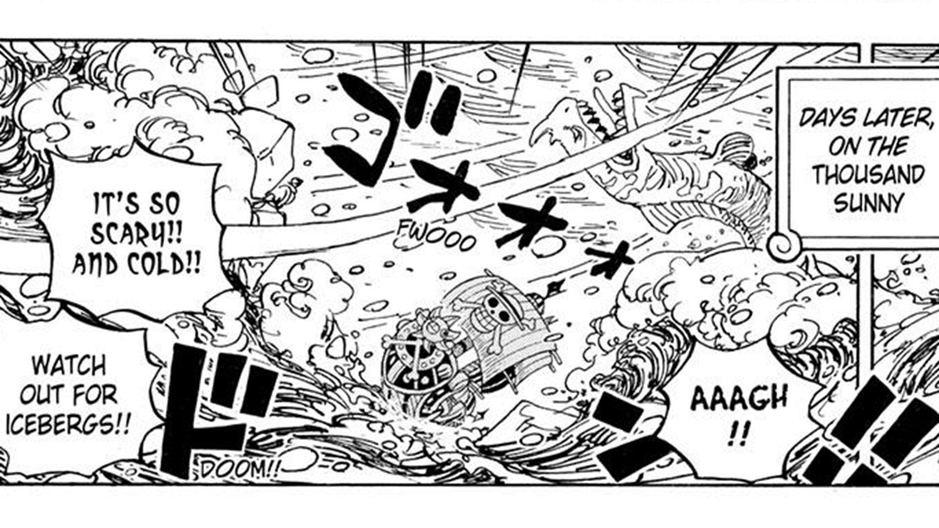 This means that the Straw Hats left Wano on Day 25 or Day 26 of the timeline. The crew then traveled for a few days, until they reached a brutally cold climate zone, where they came across a giant worm eddy. A person was trapped inside the eddy, so Zoro cut through the huge mass of water to free said individual.