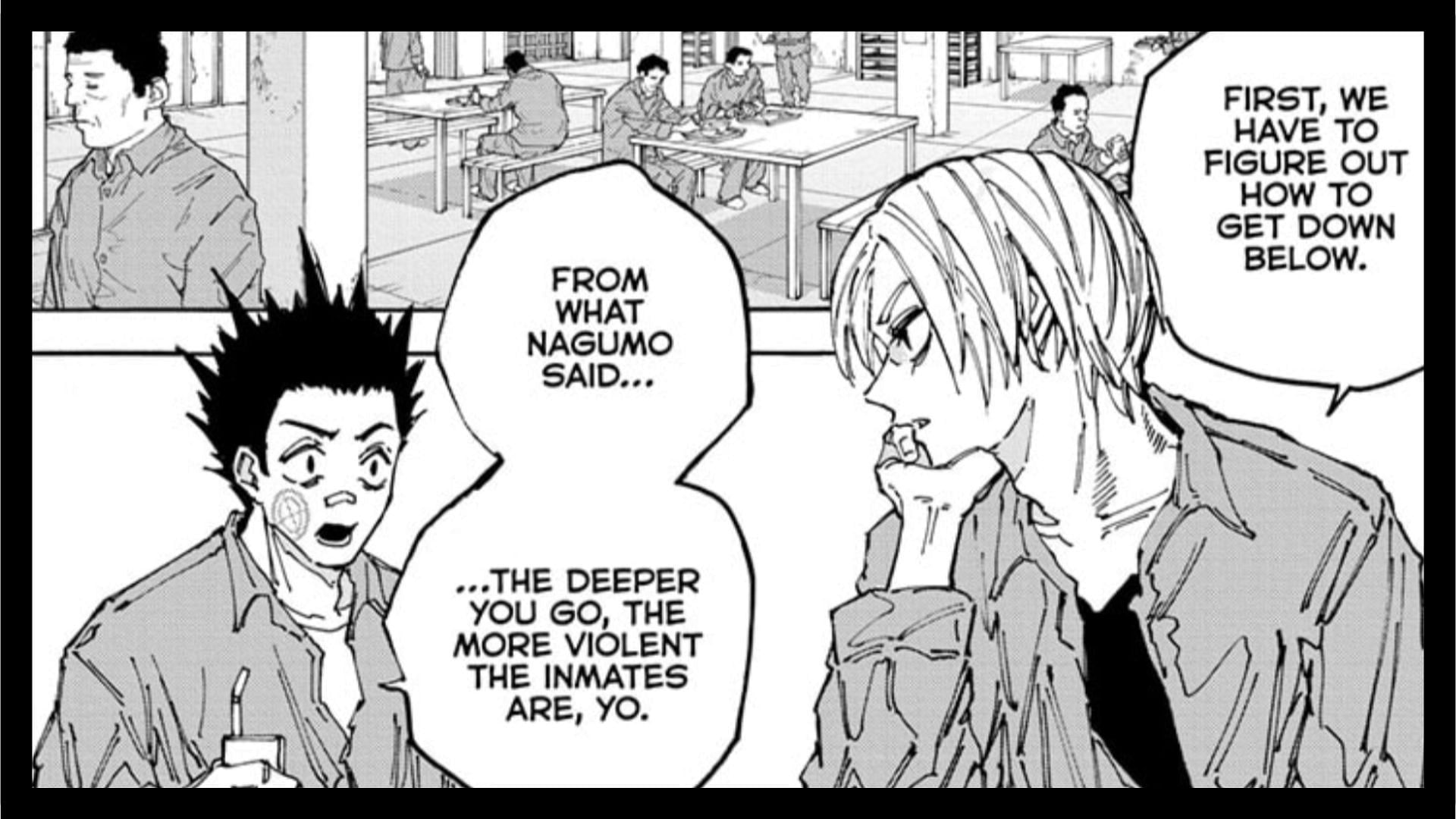 In the prison cafeteria, Shin and Heisuke were strategizing on how to reach the bottom level. One potential plan involved obtaining the keys from a guard.
