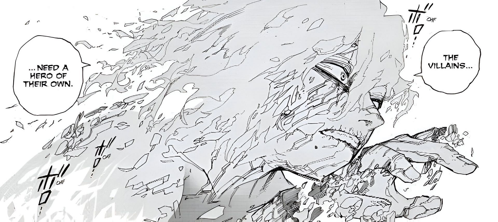 On the other hand, Deku had entered Spinner's room where they had a heated conversation regarding the passing of Shigaraki. Spinner boldly claimed that Shigraraki was his hero and taunted Deku for killing him. Shigaraki had always planned to be a hero since he was a child, so he was at least able to become someone's hero before he died.