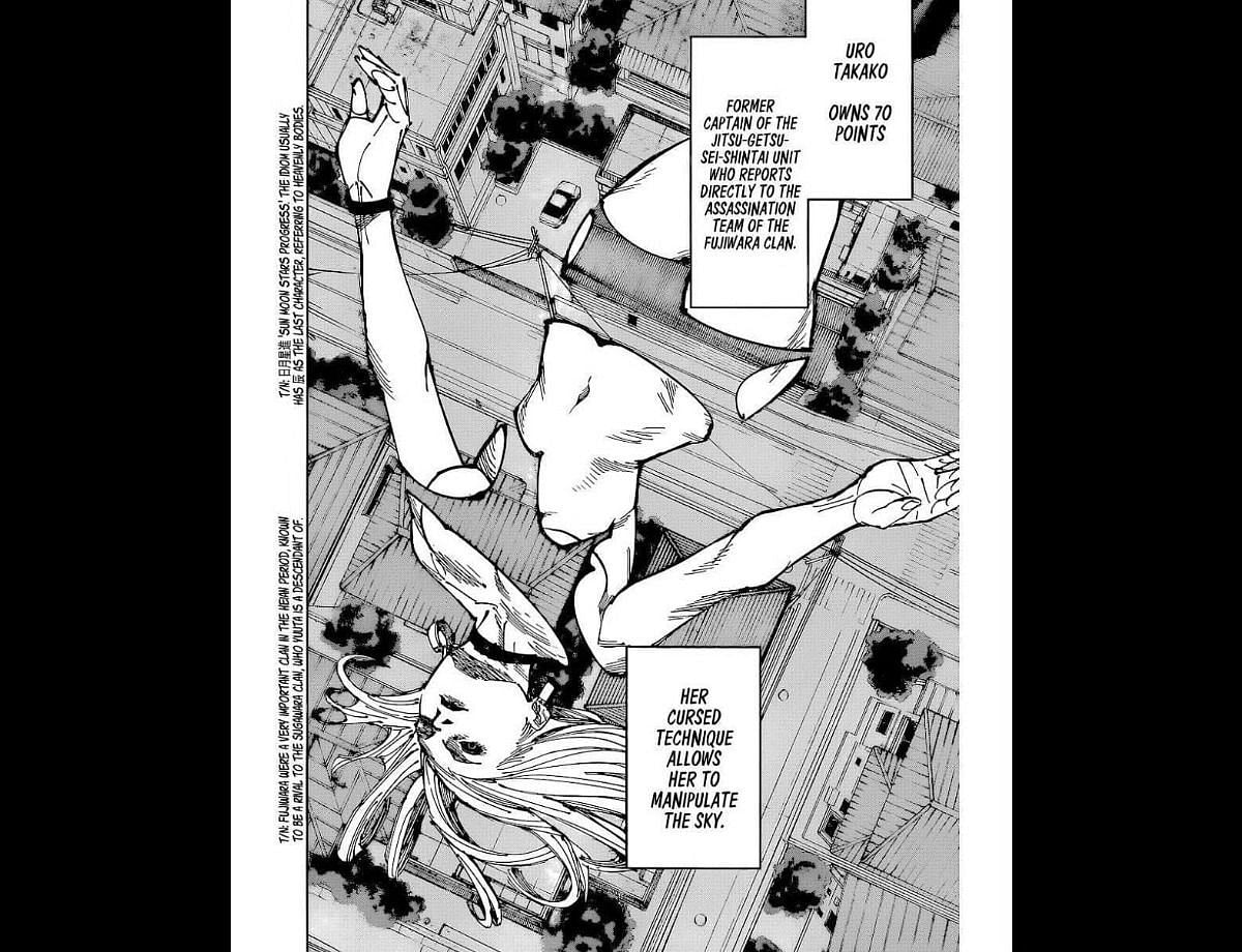 Takako Uro is another Heian-era sorcerer, who was incarnated during the culling game. Uro’s ability to “manipulate the sky” and “wrap the space” makes her extremely powerful. During, the Heian period, she led the 'Sun', 'Moon', and 'Stars' squads of the Fujiwara clan.