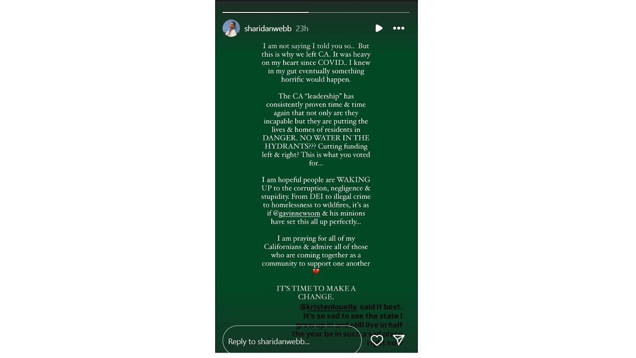 On Sunday, Sharidan Webb took to Instagram to share her frustrations about the state’s leadership. She stated the couple left California due to this.