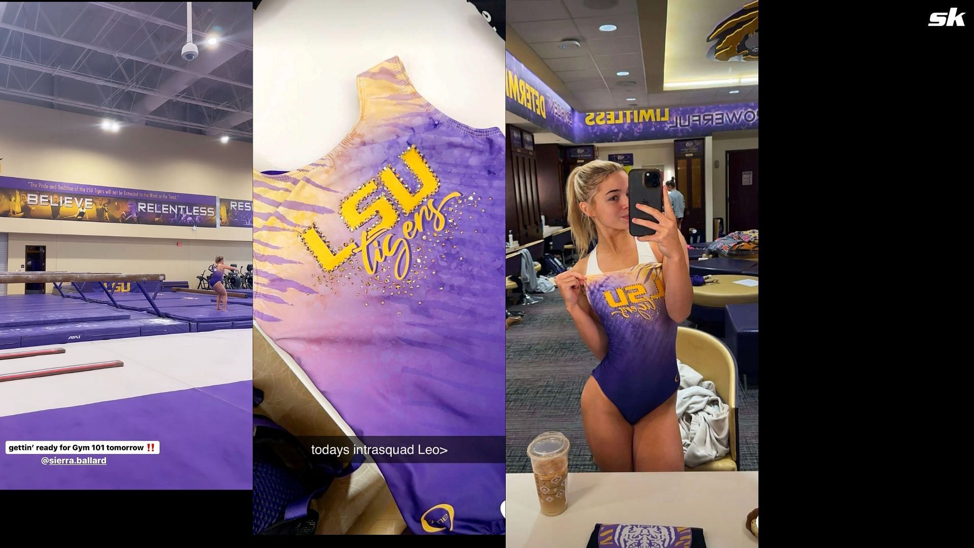 The gymnast shared a glimpse of the "Intrasquad Leo" with a glitter-embossed insignia in shades of yellow and purple. The tiger stripes gripped the design as Olivia posed in the outfit. With performance being their goal, the LSU Tigers practice during class and keep the leotards in line.