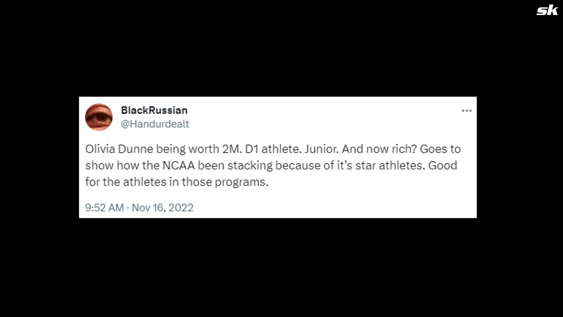 "Olivia Dunne being worth 2M. D1 athlete. Junior. And now rich? Goes to show how the NCAA been stacking because of it’s star athletes. Good for the athletes in those programs" - Handurdealt