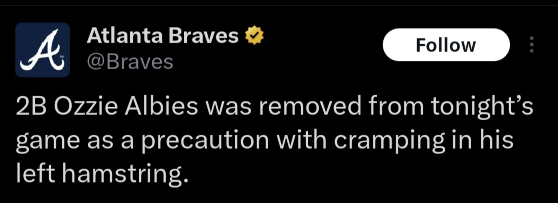 "2B Ozzie Albies was removed from tonight’s game as a precaution with cramping in his left hamstring."