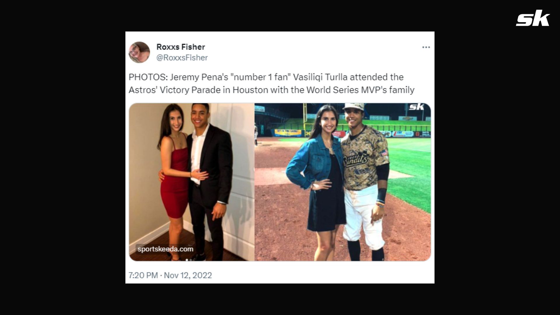 "PHOTOS: Jeremy Pena's "number 1 fan" Vasiliqi Turlla attended the Astros' Victory Parade in Houston with the World Series MVP's family" - RoxxsFisher